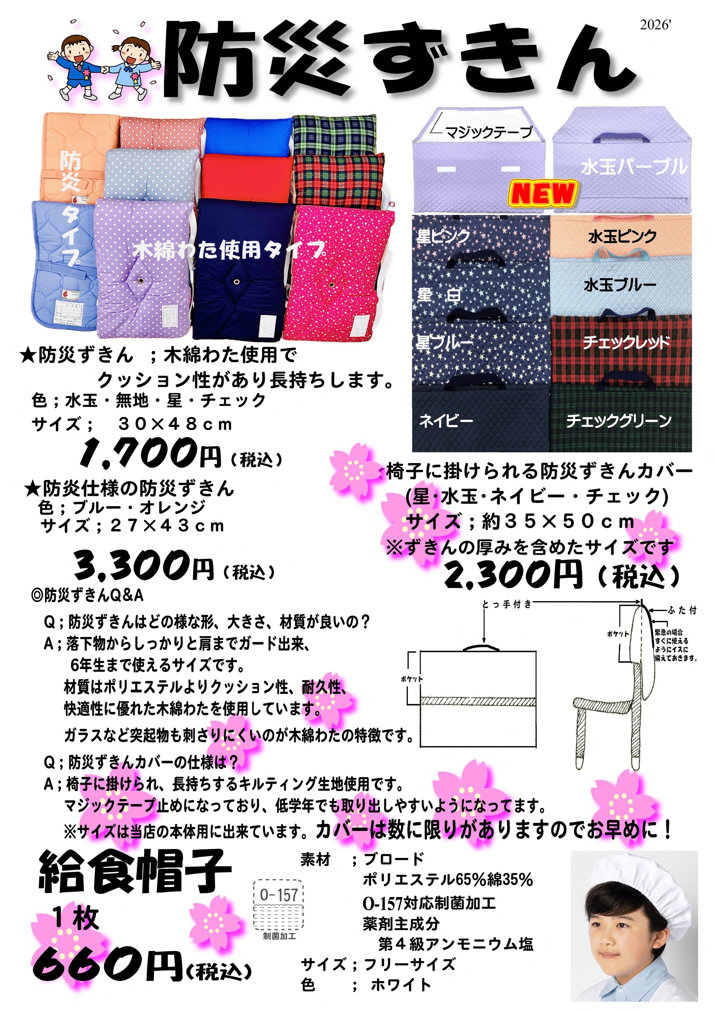防災ずきん、防災ずきんカバー、給食帽子のご予約承ります。